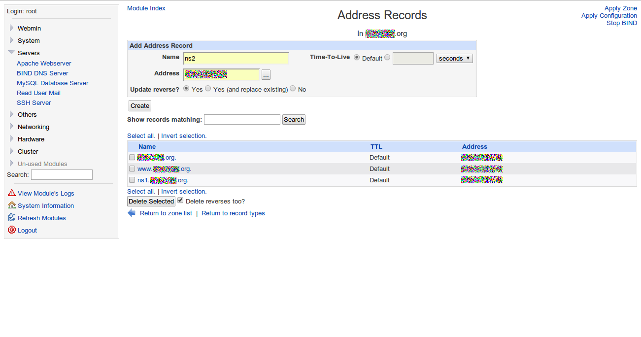 ۵-۱ ) پس از انجام مراحل قبل بطور خودکار وارد صفحه مربوط به تنظیمات A record دومین ثبت شده میشوید؛ در صورتیکه به هر دلیلی وارد این صفحه نشدید، میتوانید با انتخاب دامنه مورد نظر از قسمت تنظیمات BIND DNS Server (منوی سمت چپ صفحه) وارد صفحه مورد نظر شوید.